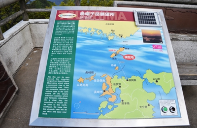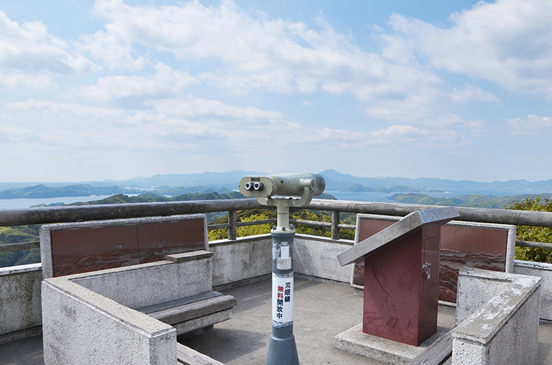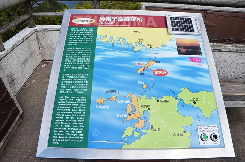 展望台からの景色は、複雑な溺れ谷、浅茅湾(あそうわん)を360度ぐるりと見渡すことが出来、この日は春がすみで遠くがかすんでいますが、案内板によると天気の条件が良ければ、北東方向に韓国釜山の山並みが見えるとあります。