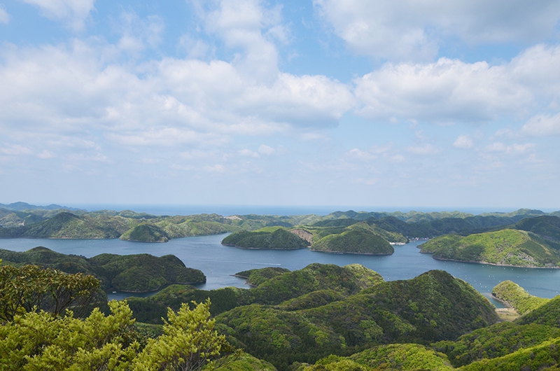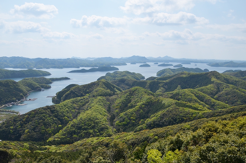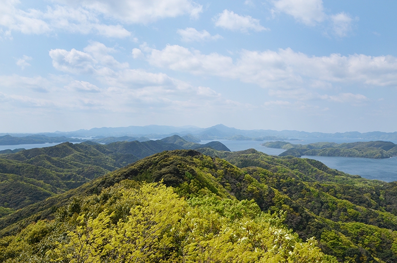 眼下には新緑の山々、白い波をたてて走る漁船、養殖のブイ、のどかな漁村などの景観が広がっていますね。対馬の中央部からこうしてぐるっと眺めると、改めて対馬の大きさを実感しました。