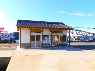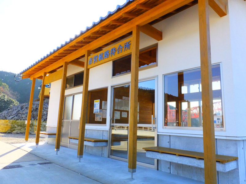 美津島町鶏知の長板浦(ながいたうら)、先日開院したばかりの対馬病院の方向へと進むと小さな船着場があり、待合所が見えてきます。