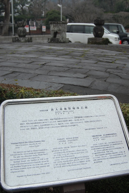 稲佐悟真寺国際墓地に行くには、バスが便利。近くのバス停の名前は、悟真寺前バス停。そのバス停近くに、さっそく看板が。唐人墓地祭場所(まつりばしょ)石壇です。戦時中、悟真寺境内の国際墓地内に移されていたそうですが、戦後再び現位置へ。1659(万治2)年、長崎在住の唐人たちが、死者の霊を慰めるための祭場所として作られたそうです。