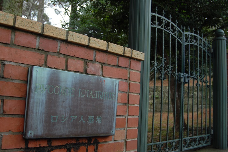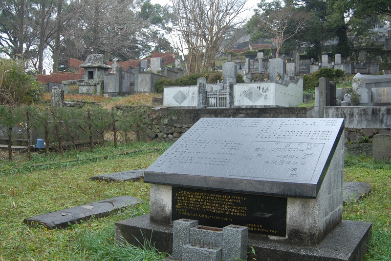 ロシア人墓地があります。1858(安政5)年、ロシアのフリーゲート艦アスコルド号でコレラが発生し、死亡した乗組員を埋葬するために造られました。だけど、なんで稲佐でロシア?と思われる方もいると思いますが、1853(嘉永6)年、ロシア使節プチャーチンが長崎に来航し、稲佐に上陸を許されて以来、50年もの間、海軍の滞在地として賑わったという歴史があります。