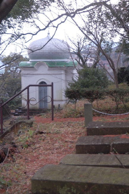 ロシア人墓地の敷地内には入れませんが、レンガ塀のところからでも、写真の白いチャペルが見られます。かつては、ロシア艦隊が長崎で越冬し、稲佐一帯がロシア村と呼ばれていたほど。繁栄していた証のようです。