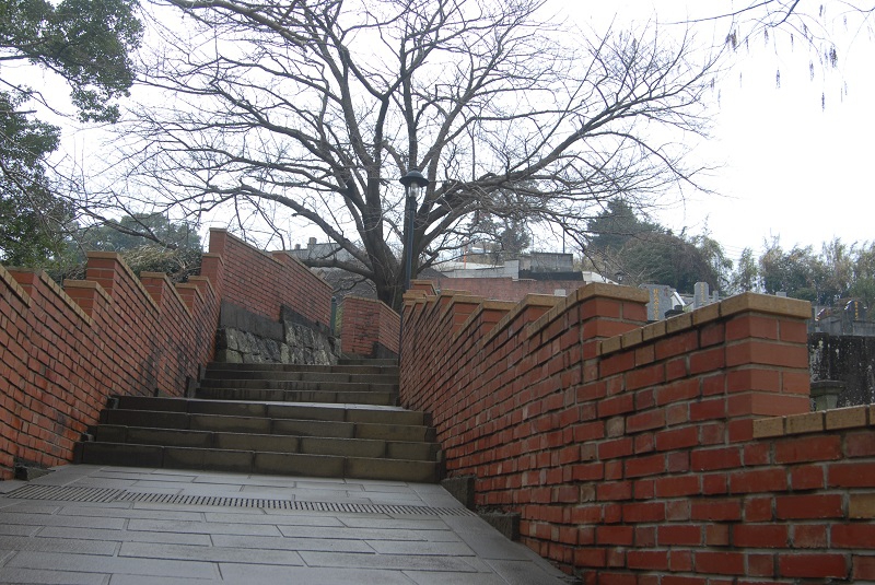 墓地というとなんとなく全体的にグレー一色の世界が広がりがちですが、石段にレンガ塀が、まるで異国に来たかのようです。ココが、私のオススメの細道。