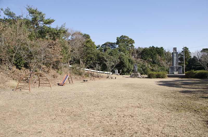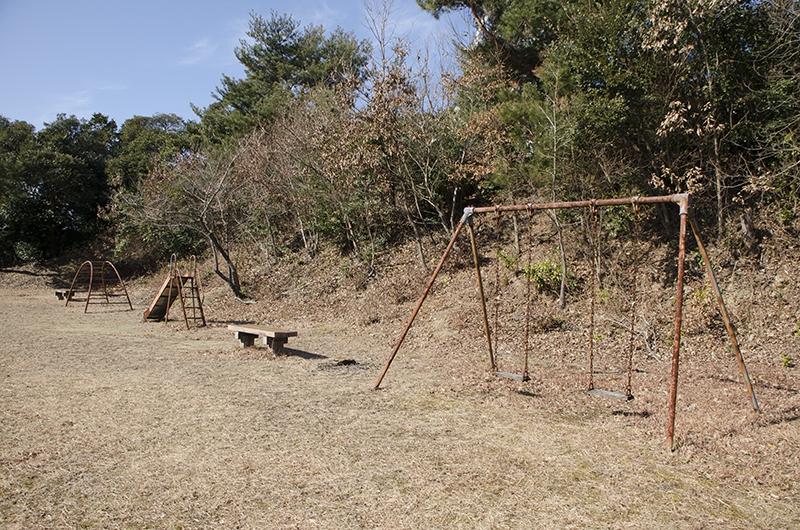 旧道から細い山道を登っていくと、そこにあったのは古い公園。雑草は刈られて手入れされていましたが、ブランコや滑り台などの遊具はサビが出て、しばらく使われてないような感じでした。