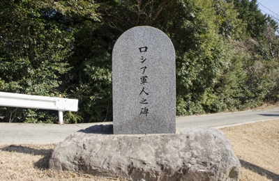 三つめの石碑は「ロシア軍人の碑」とあります。石碑の裏に説明文が彫ってありました。それによると『1905年(明治38年)5月27日の日本海、対馬沖海戦において不幸にも対馬の地で永眠された軍人、五人を二つの浜石をもって墓碑とし、手厚く葬られていた。遺骨は1909年5月に長崎市の稲佐山口のロシア人墓地の合祀碑に埋葬。その後も住人たちにより墓地の清掃は絶えることがなかったという。ここに百周年を迎え、勇敢に戦った五人の氏名を刻むとともに両国の平和と友好交流が深まることを祈念して建立する・・・2005年(平成17年)5月27日 対馬・歴史顕彰事業推進委員会』とありました。