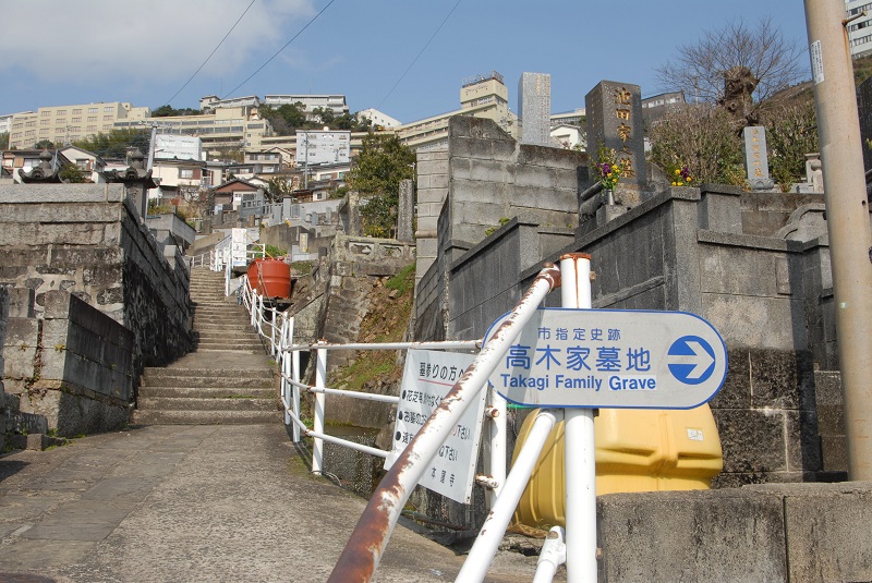 市指定史跡にもなっている高木家墓地。町年寄であった高木家は、1739(元文4)年、八代・忠與(ただよ)の時、長崎代官三千石に任ぜられ、代々勝山町に住み、代官を勤めたそう。江戸期の長崎町年寄と代官の墓碑として五輪形式の墓碑が揃っているのが珍しいそうですよ。と案内看板に書いてありました♪