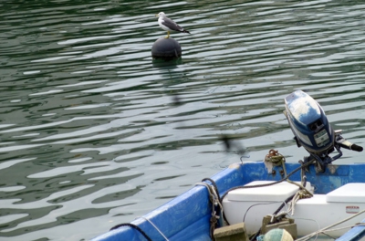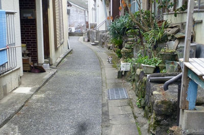 橋を渡って右側は埋立地で、漁協や魚市などの漁業関連施設が固まっています。左側が昔からの「丸木」地区です。タイムスリッ プできますよ。 早速ノラのお出迎え。