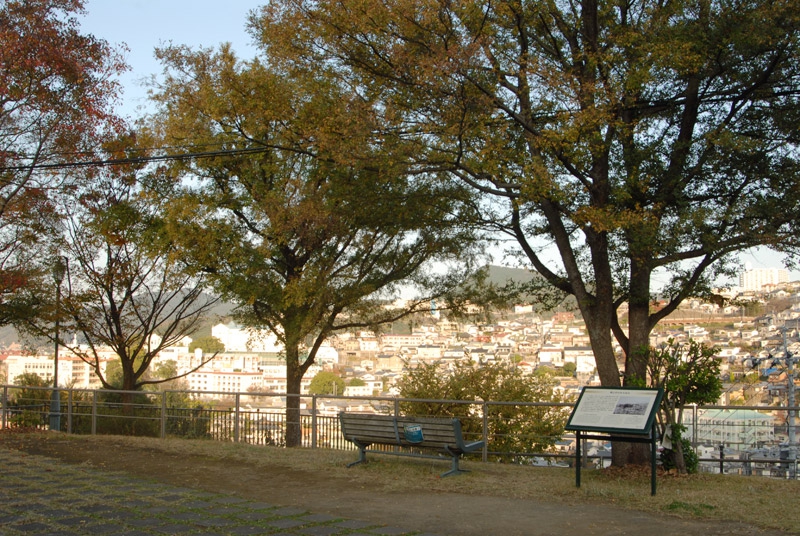 じゃじゃ~ん。木々の間から長崎の街並みが眼下に広がります。ちょっと頑張って上ってよかった。長崎、バンザ~イ♪