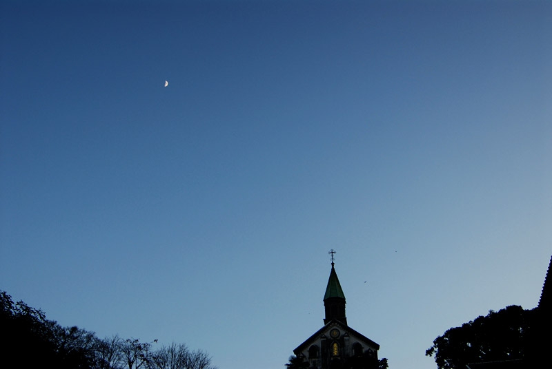 大浦天主堂に着きました。ふと空を見上げたら、お月さまが。ほんわか気分に浸りながら、本日のプチ歩きは終了です。