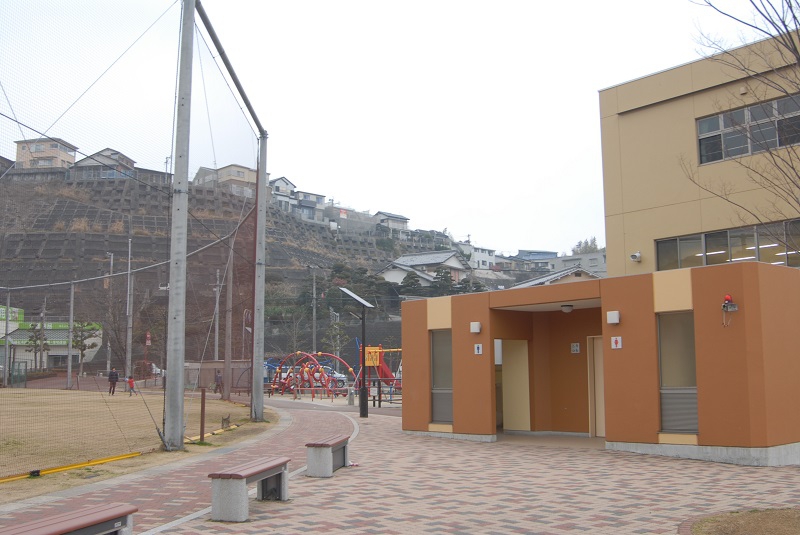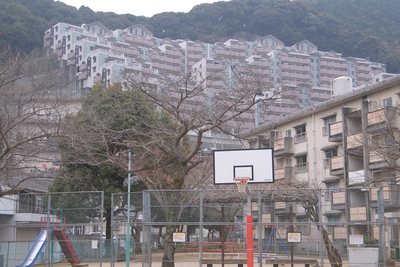 下ると、最初の大園小学校が面している大通りに出たので、太神宮バス停方面へ戻ることにしました。すると、滑石らしい光景が。滑石といえば団地。山の手までアパートが続きます。手前のバスケットボールのゴールが小さく見えますね。大園公園は、迫り来る!?団地を見ながらスポーツが楽しめます。