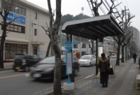 太神宮前バス停にたどり着きました。この大通りの先が、国道206号線です。道路も歩道も拡張してキレイになったので、細道ではありませんが……。とりあえず歩いてみることにしました。
