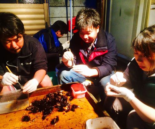 ウニ漁を終えてからがもうひと作業。ウニかきが待っています。今回は取材で来ていたテレビ局の方も半ば強制的!?にお手伝いしてくださいました。家族4人分のウニかきが終了したのは夜の22時すぎ。この作業なくして美味しいウニは食べれないのです。