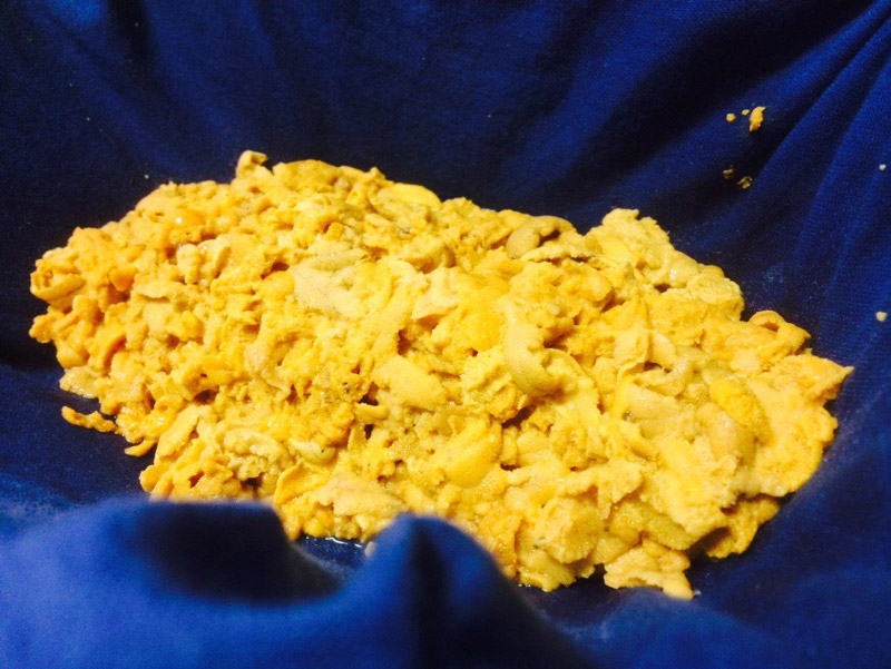 楽しみながらも苦労して収穫したウニがこちら。ウニかきした後塩水で洗ったウニです。黄金に輝いております。