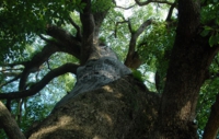 山王神社の大クスです。樹齢500年以上で、幹回りが約8.6m(右)と約6.6mあります。一時は、爆風と熱線によって枯れかけましたが、2ヵ月後に再び芽吹いたといいます。原爆投下後は「長崎に草木は生えない」といわれていたと聞きました。そんな中、この大クスがどんなにか人々を慰め、希望を与えたことか。今でも枝葉を空いっぱいに広げ、堂々と呼吸しています。