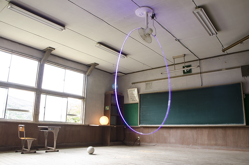 次は様々な素材を使い扇風機で動きをつけたアート作品が多い黒田大祐さんの「幻日」(LED・運動場)幻日(げんじつ)とは、太陽の横に現れる大気現象のこと。窓側に置かれている椅子に座って外の景色と教室内の作品を見ることで幻の太陽を表現しています。運動場の楕円形と対をなすLEDの輪は扇風機で動きながら、色が変化していました。