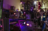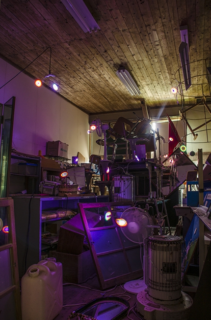 真っ暗で様々な学校備品が置いてある部屋には、小さくて丸いネオンと扇風機が何やら怪しい光を放っていました。黒田大祐さんの「幻日・風・ネオン」まるで、ゲームの中の秘密基地もしくは廃墟を連想させるような空間ですね。