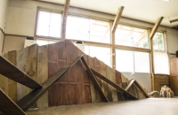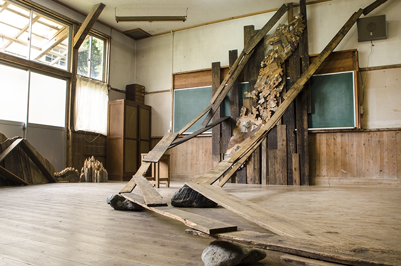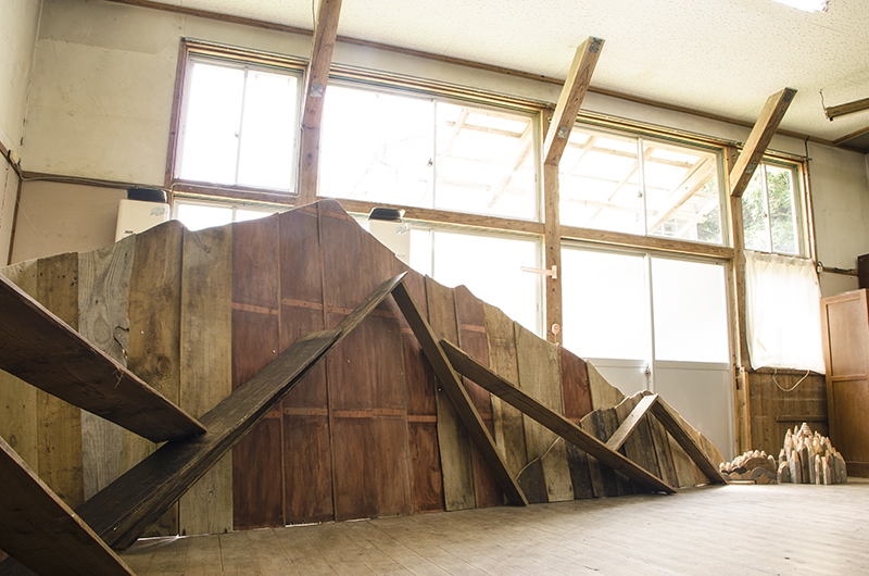校舎の廊下まで続く古材の海流の先には、対馬がありました。彫刻家の伊東敏光さんの「海流の島」と会場の廃校がある内院地区の山と入り江にある女神が住む島、納島をモチーフにした「内院周景」