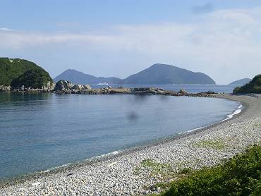 これが後で悲劇を呼び込みます。それはさておき峠を越えて目に飛び込んできた舅ケ島の景色は、福江島できれいな海を見慣れている僕でも思わずウワァオー!と声が出てしまったほどの絶景でした。福江島の浜はほとんどが白砂なんですけど、こちらは丸石の浜なので海の透明度が違うんです。