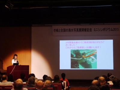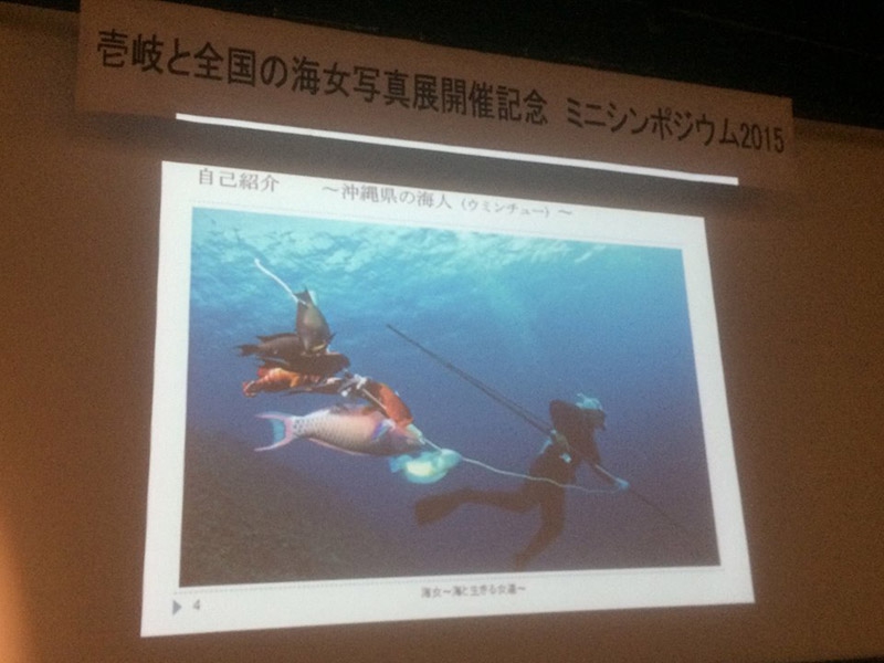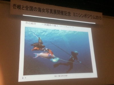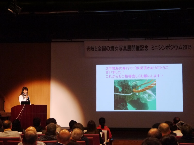 11月26日、一支国博物館で、壱岐と全国の海女写真展開催記念で、ミニシンポジウムを開催しました。基調講演では、写真展の写真を撮影してくださった海人写真家の古谷千佳子さんが、海人写真家になるまでの道のりや、海の素晴らしさをお話して下さいました。「海は隔てるものではなく繋ぐもの」という古谷さんの言葉がとても印象的で心に残りました。そして私の3年間の海女修行報告。
