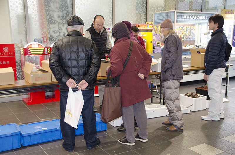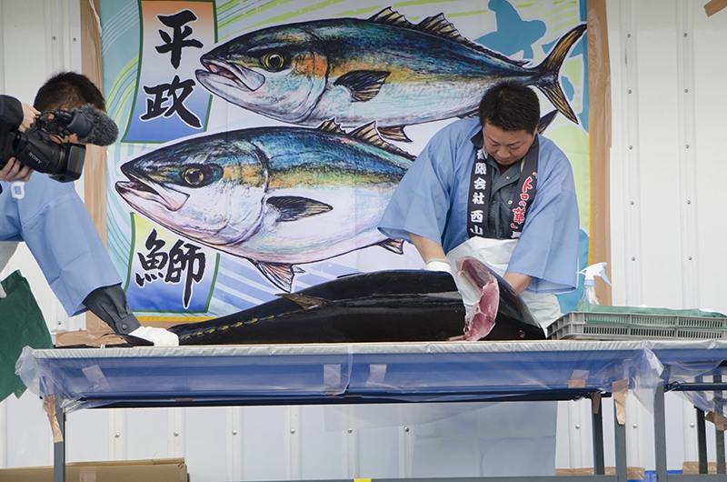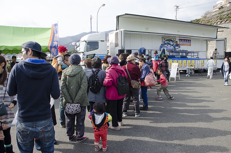 11月22日に開催されたオープニングイベントではマグロの解体ショーと試食会が行われ、対馬のブランド魚「トロの華」が無料で試食できるとあって長蛇の列が出来るほどの人気でした。