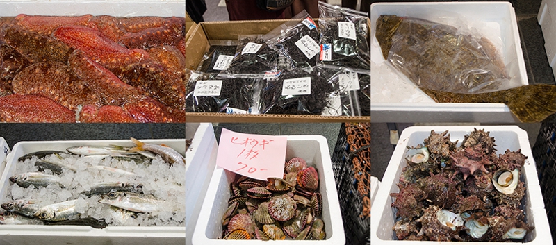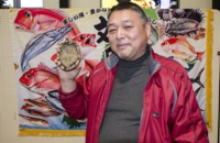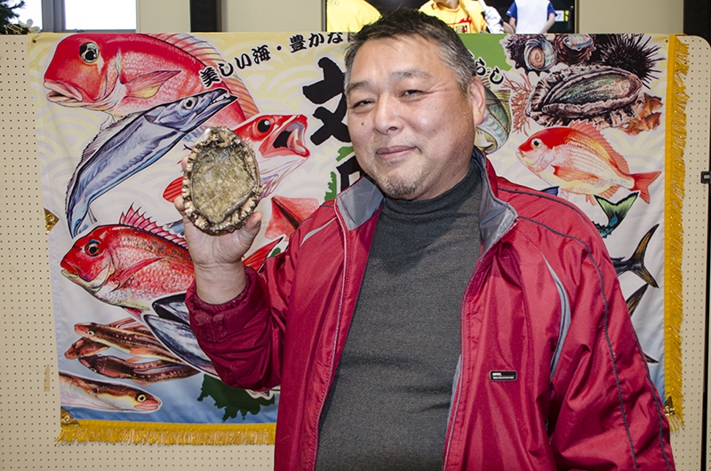 サザエはまだ禁漁期間の場所が多く、水揚げが少ないため1キロ1500円と高めの値段でしたが、ひおうぎ貝は1枚70円とお得。私は焼いてバターと醤油で食べるのが好きです。写真を撮ってると出店している水産会社の社長さんがやってきました。以前からの知り合いなので、「商品持ってアピールしてください」とリクエストすると恥ずかしがりながら、アワビを手に写ってくれました。