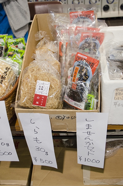 加工品のコーナーでは海草のしらもが販売されていました。島内ではあえものやサラダ、刺身のけんとして使われています。あまりメジャーな食べ物ではないので、若い方は知らない食材かも知れませんが、このような食通祭では色々と見ることができて楽しいですね。