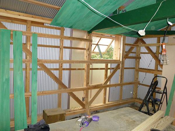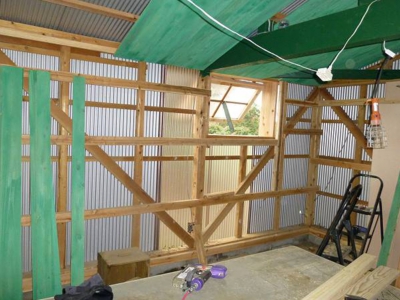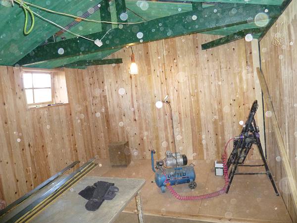 まずは、ボロボロになっていた壁などの補強から。徐々にスッキリしてきました。 天井や梁、柱などはグリーンでペインティング。