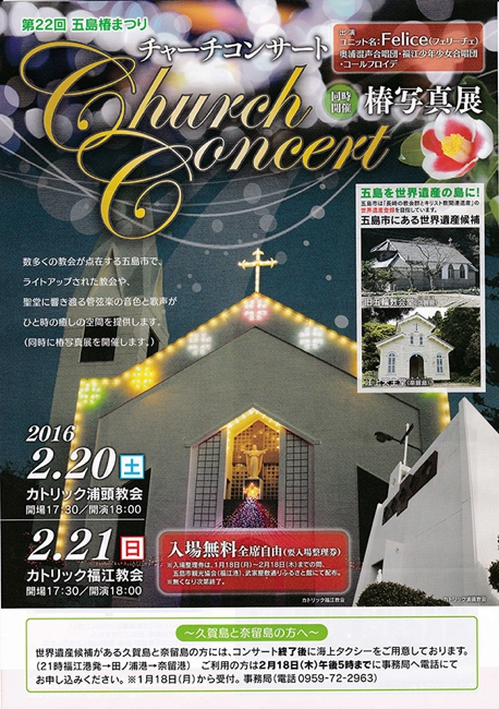 そしてもうひとつの目玉は「チャーチコンサート」です。昨年の暮れにはゴスペルの本場、アメリカからゴスペル・コーラスが来島して、素敵なゴスペルを聞かせてくれましたが、今回はチャーチコンサートのために結成されたユニット、Felice フェリーチェが演奏してくれます。また五島のコーラス、3グループも出演します。