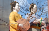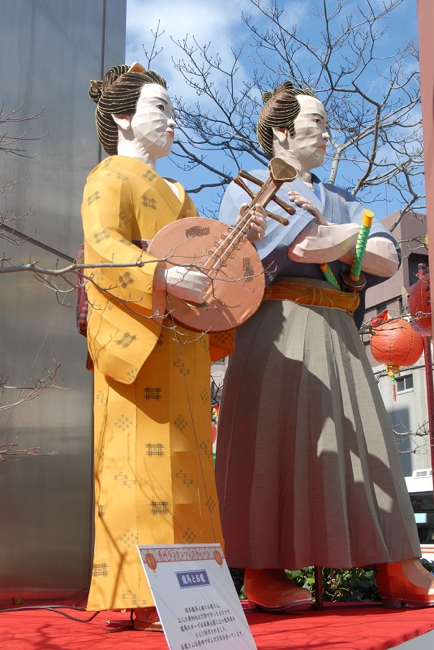 人物型のランタンもあります。中央公園会場近くには、坂本龍馬&お龍さんのランタンがありました。あえて顔のパーツをデフォルメするようなことなく、写真で見る、あのしゅっとした龍馬&お龍さんに、ややほっとしました。