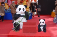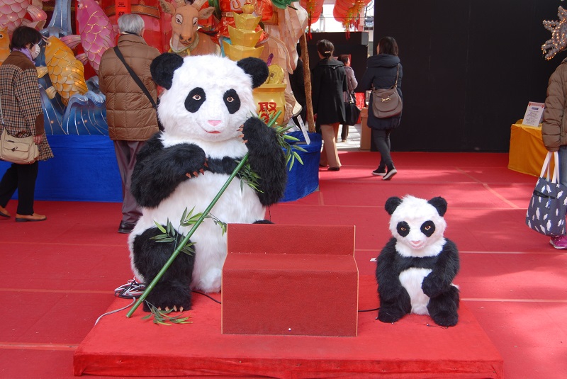 王道を写したら、いざ、面白ランタンの旅へ。さっそく湊公園でパンダに遭遇しました。普通、パンダというと可愛らしいイメージですが、中国ランタン(中国提灯)はあくまでもリアリティを重視。座って一緒に撮影できるようになっていましたが、誰一人座らず。この媚びていない感じに心打たれました。