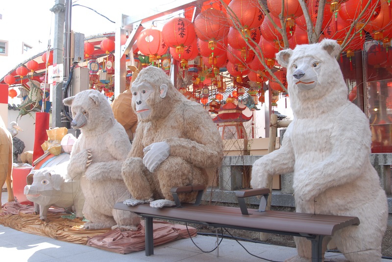 パンダと同様、湊公園にあった動物ランタン。なぜゴリラとシロクマのチョイスになったのか不明ですが、こちらも迫力満点。若者男子がこわごわと横に座り、撮影をしていました。その気持ち、わかる……。