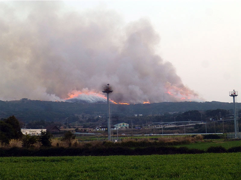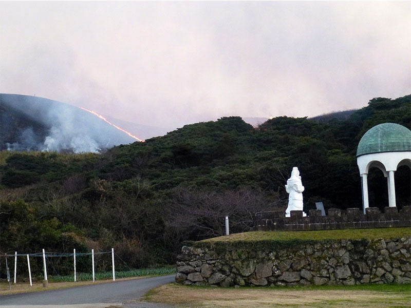 2月12日のレポートで、五島椿まつりの一環として鬼岳の山焼きが13日か14日に行われます。天候不良の場合は一週間順延です。と書きましたが、延びに延びてやっとのことで27日の土曜日に行われました。