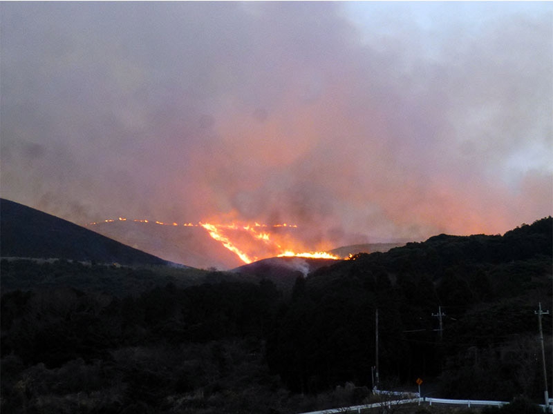 鬼岳の中腹には立派な駐車場があるんですが、残念ながら我々下々の一般人は中腹にあるリゾートホテル「コンカナ王国」の入り口で通行止め。気温が高く晴れ渡ったこの日は、見る見る火が燃え広がって山焼きというより、山火事みたいに・・・。
