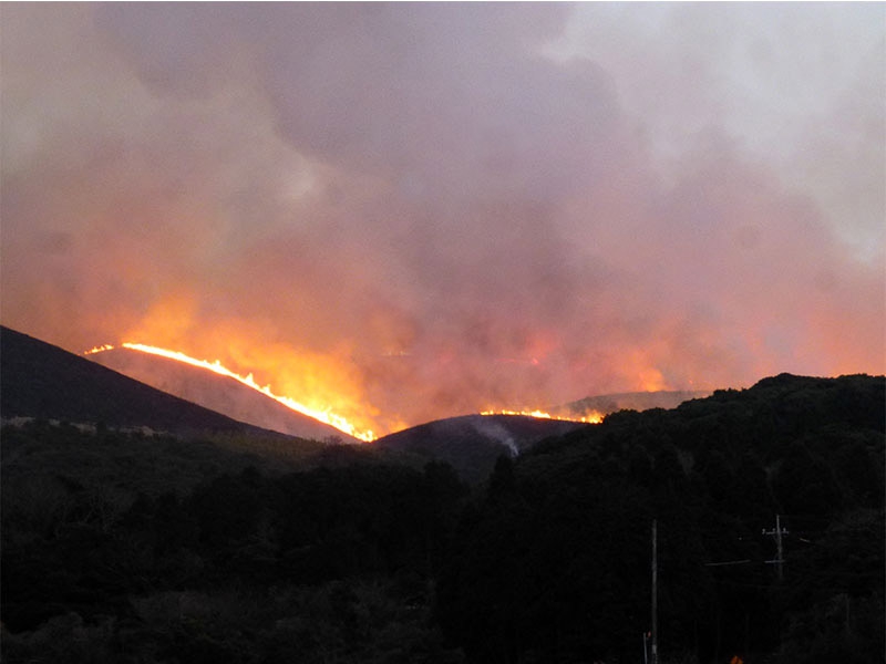 この日は20度近くまで気温が上がり、最高の山焼き日和(?)でした。夕方6時に160人の消防団員がサイレンの音とともに一斉点火。その5分後にはもうこんな状態まで炎と煙が広がりました。圧巻!