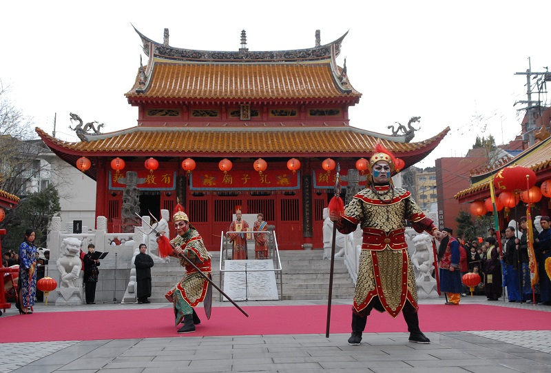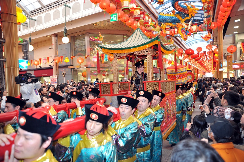 もうひとつは媽祖(まそ)行列。江戸時代、長崎に入港した唐船の乗組員たちが、実際に行っていた行列です。媽祖とは、航海安全の神とされる女神さまのこと。写真は孔子廟での様子。