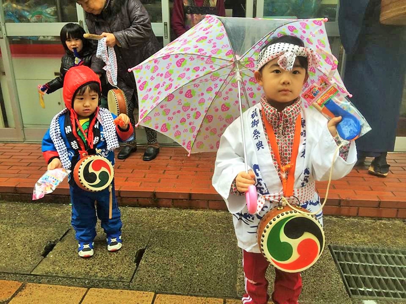 お教さんというのは、壱岐の島内の数カ所で行われている行事で、お寺から持ちだしだ経本を納めた木桶を持ち、太鼓を叩きながら1軒1軒回ります。太鼓を叩くのは地域の子供たち♡この日は生憎の雨と平日という事もあり、太鼓叩き隊はちびっ子3人だけでしたが、頑張って叩いてました(´∀`)