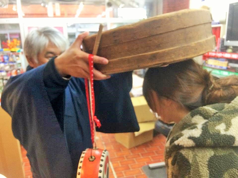 ちなみに今日がお経さんという事を知らずにいた私は、早朝まだ外が暗い時間、すやすやと寝ていると、外から太鼓の音と共に、「お~きょう~お~きょう~す~らいらい」という男の人の低い声が!!!《゚Д゚》目が覚めて怖くなり、隣で寝ていた旦那さんを揺すり起こし、私「い、いま太鼓の音と唸り声みたいなのが外から聞こえたんだけど!泣」旦那さん「、、、え?、、、、むにゃむにゃ。。あ~お経さんだよ、、」zzz…完全に生きてる人間じゃないと思った私(笑)まだまだ島っこ2年生です(´∀`)経本が入った桶を頭に乗せてもらい、一年の無病息災を願ってもらいます。