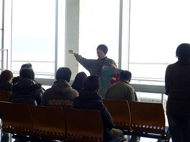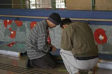 今回取材にお邪魔させていただいた時は、2月14日から始まる「椿まつり」に合わせて、福江港の大波止ターミナルを「ゆうなぎ」の通所者さんたちと一緒に、椿の貼り絵で飾り立てている真っ最中でした。