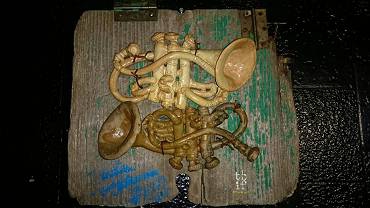 実は私も宮脇ちんさんの作品を持っています。どうですか! ンーん。アバンギャルド!彼は何を隠そう(別に隠してもいませんがね)私の音楽仲間で、宮脇ちんさんがギター、私が三線で「九弦(きゅうづる)」というデュオを組んでライブなどを演っているんです。そのご縁でこんな素敵な作品をいただきました。私の宝物です。