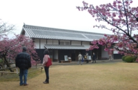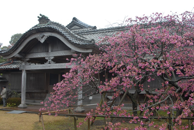 堂々たる緋寒桜と鍋島邸の主屋。緋寒桜は、2月中旬から3月にかけて咲きます。広い庭園には、芍薬やヤマボウシ、藤棚もあり、春夏秋冬それぞれのお楽しみが。