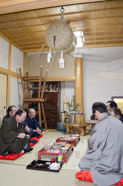 酒宴は午後7時半ごろから始まり、なごやかに談笑しながら夜遅くまで続きます。退席する際は本座を出るときと再度入室するときに、ご神体に柏手を打ち拝まな いといけないのですが、それを怠ると罰ゲーム的な感覚で、余計にお酒を飲まされるとか、「お酒はもう飲めません」と言うかわりに「「水ばかりやっても米は 育たないから下の田んぼへ水を流してください」とお酒を水に、頭仲間を田んぼに例えて応答するようなお米の神事らしい様々なしきたりや、取り決めがあるということでした。