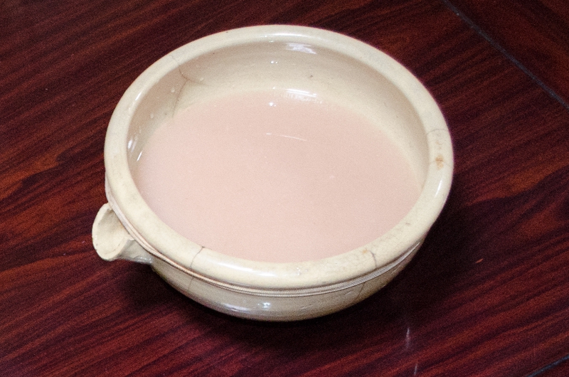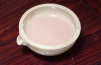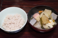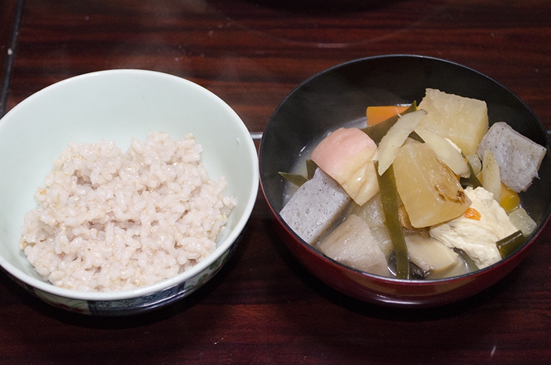 控えの間で見学していた私にも、本座と同じ多くの料理と、赤米の甘酒、炊き立ての赤米や豆酘雑煮(この地区に伝わる郷土料理)までふるまっていただきまし た。頭仲間と同様、注ぎ鉢からお椀に注いでもらった甘酒は、ほんのりピンク色をした自然な甘さの飲みやすいお酒で、「熱いうちに食べてください」と言って 出された赤米の炊き立てご飯は、お赤飯より薄い色でこちらも豆酘雑煮とともに美味しく頂きました。