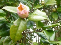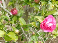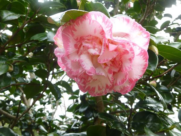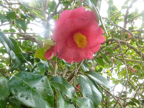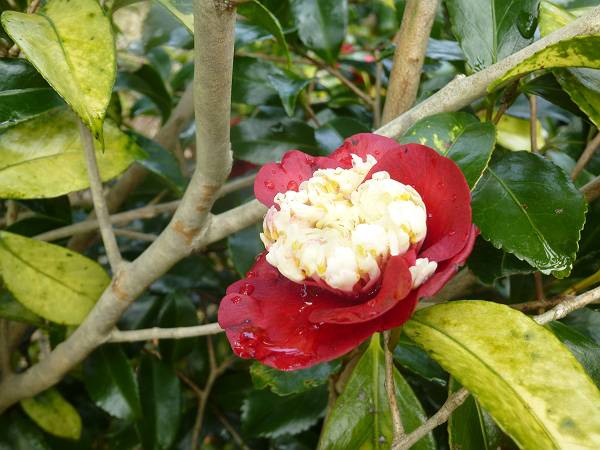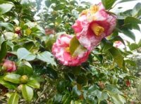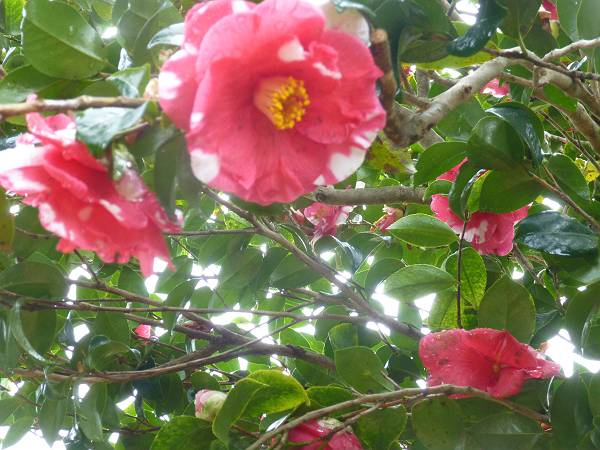お出迎えするする椿。エントリーNo.1はこの椿です。その名も「京錦」