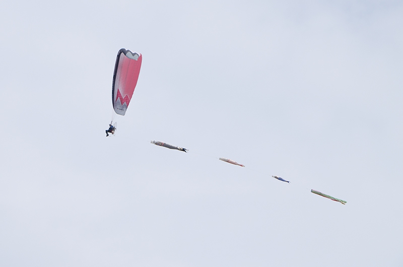 会場に着くとブンブンと空からエンジン音が聞こえるので、流行のドローンで空撮でもしてるのかと見上げると、エンジン付きのパラグライダーが鯉のぼりをヒラヒラさせながら飛んでいました。