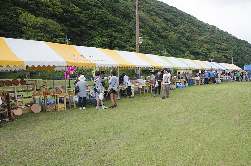 祭り会場の湊浜シーランドステージでは、テントが並び、焼き鳥やお好み焼き、うどんなどが販売されお祭りらしい雰囲気の中、ここ佐護の名物として普段は目にすることが無い「うむしもん」を地元の方たちが販売していました。これはお祝いや行事のときに作られてきた餅菓子で、ほんのりと甘く、食紅で色が付けてある様子は、あじさい祭りのお土産にぴったりですね。