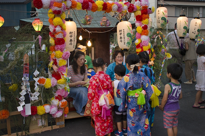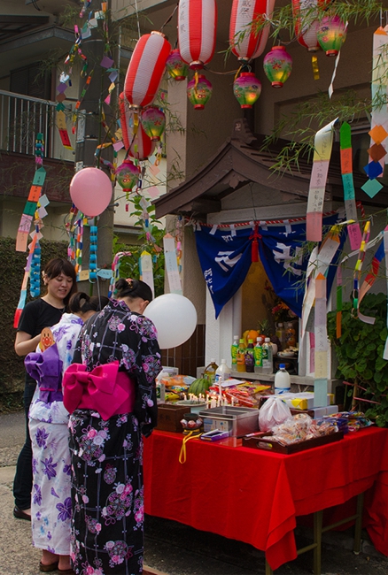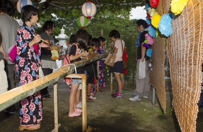 今年も地蔵盆がやってきました。この日、夕方6時頃から浴衣を着ておめかしした子供たちは、町内30ケ所以上に祀られている地蔵堂を巡り、無病息災を願い小さい手を合わせます。お参りした後は、お菓子を貰えるのですが、天台宗のお寺、醴泉院では恒例の流しソーメンで子供たちをもてなすことが知られており、大勢の参拝客で賑わっていました。汗ばんだ体に冷たいソーメンが美味しそうですね。