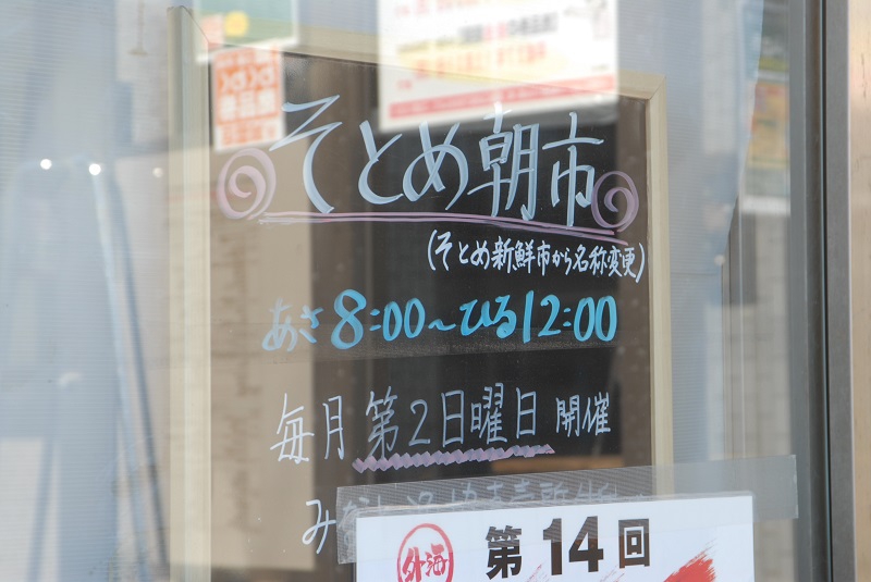 再び、通りを歩いてみると、また気になる情報を発見。そとめ朝市とな。毎月第2日曜に開催中。こちらも朝のドライブルートに加えたくなるイベントです。