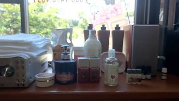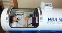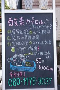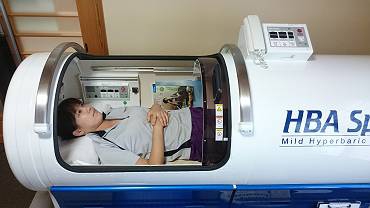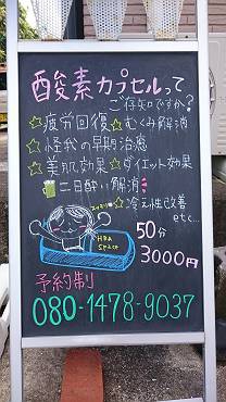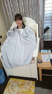 治療院には、酸素カプセルやよもぎ蒸しなどの、五島では珍しい設備を導入しています。ちょっとお茶目なよもぎ蒸しのポーズ。治療以外にも足つぼマッサージやアロママッサージ・フェイシャルエステなど多数のメニューがあります。