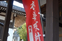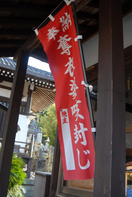 本堂から向かって右側にあるのが今回のメインとなるコンコン婆さんがご鎮座する閻魔堂。赤いノボリが気になります。見てみると……。