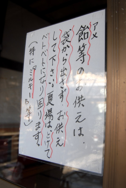 その前に、ガラス戸には注意書きが。納得。みなさまもお気をつけあそばせ。忘れておりましたが、咳を止めたい、もしくはかかりたくないと思った方は、飴玉を持参して祈願すると良いといわれています。